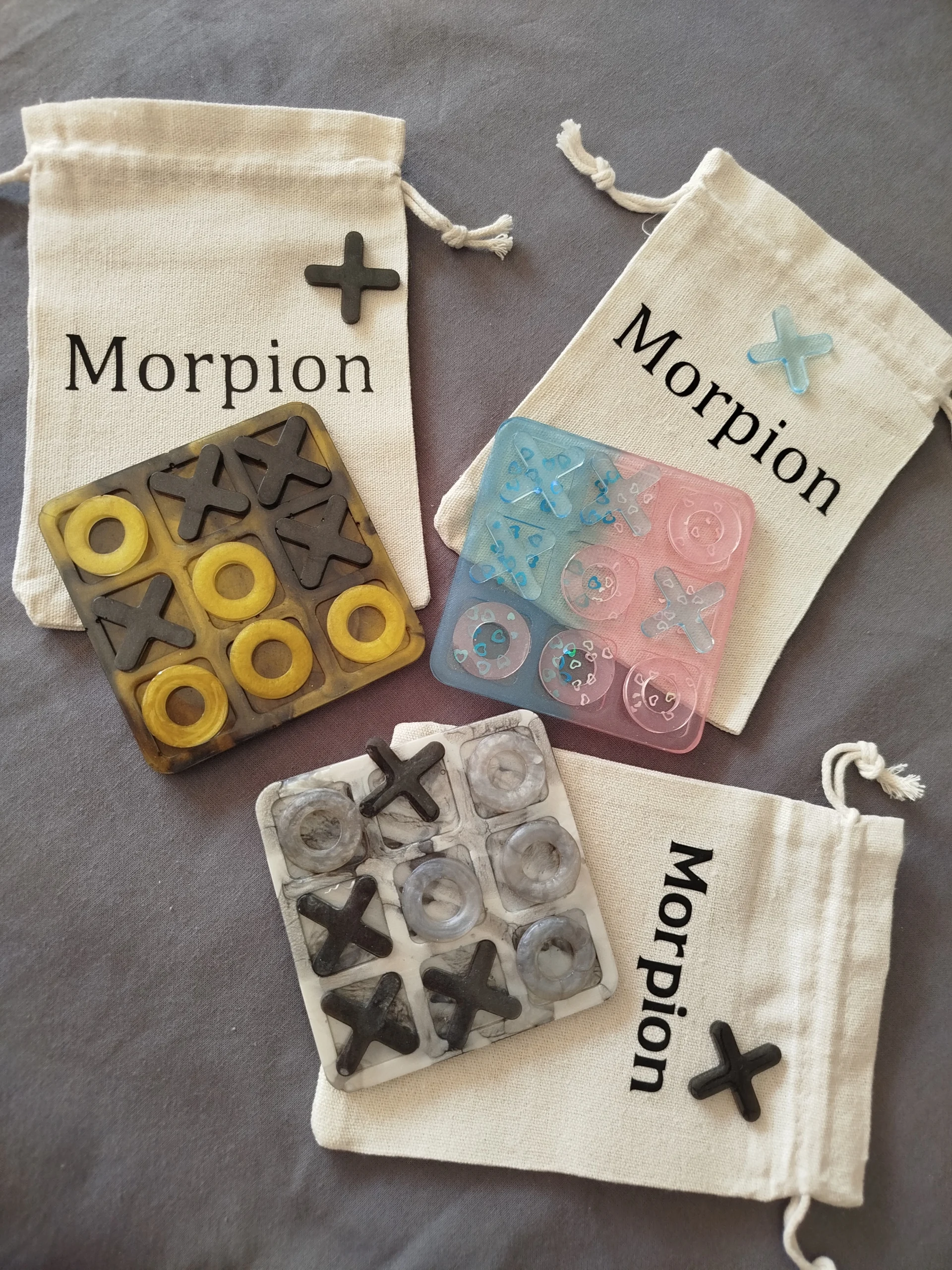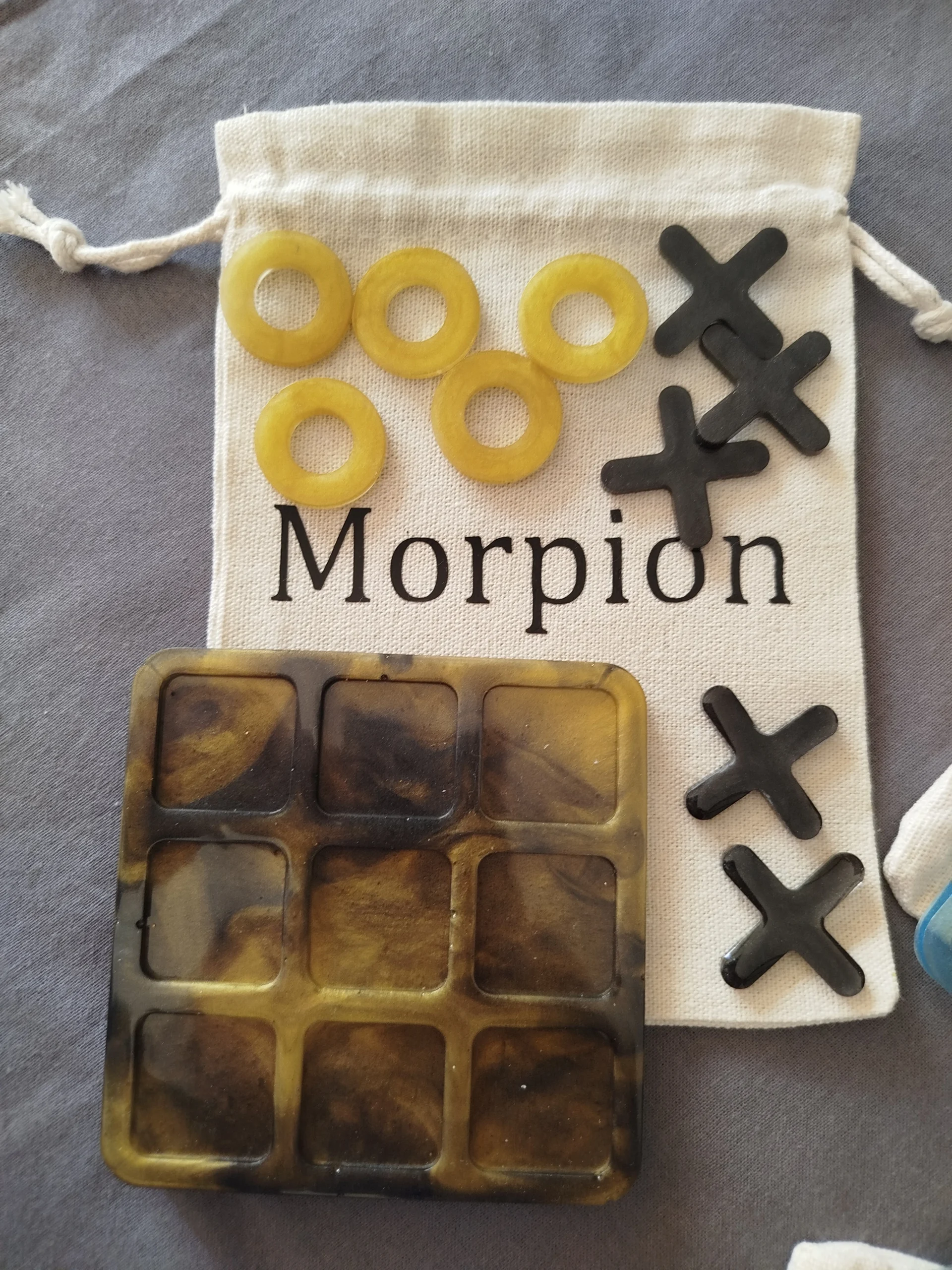 - Le Plateau : Le plateau de jeu (la grille 3x3) est coulé dans une résine époxy foncée et chatoyante (tons noir/gris fumé avec des reflets subtils), lui donnant une base solide et visuellement riche.