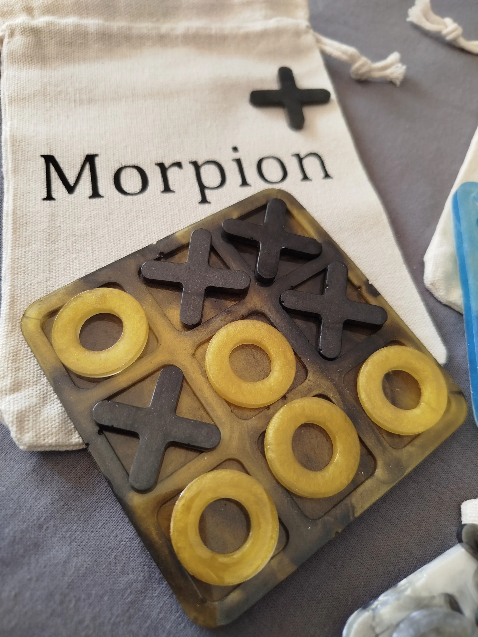 Le jeu est livré avec une pochette de rangement en toile (ou coton) sur laquelle est inscrit le nom "Morpion". Cette pochette :