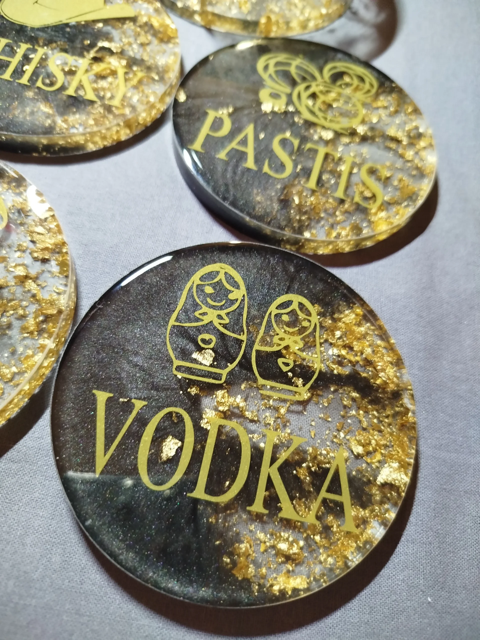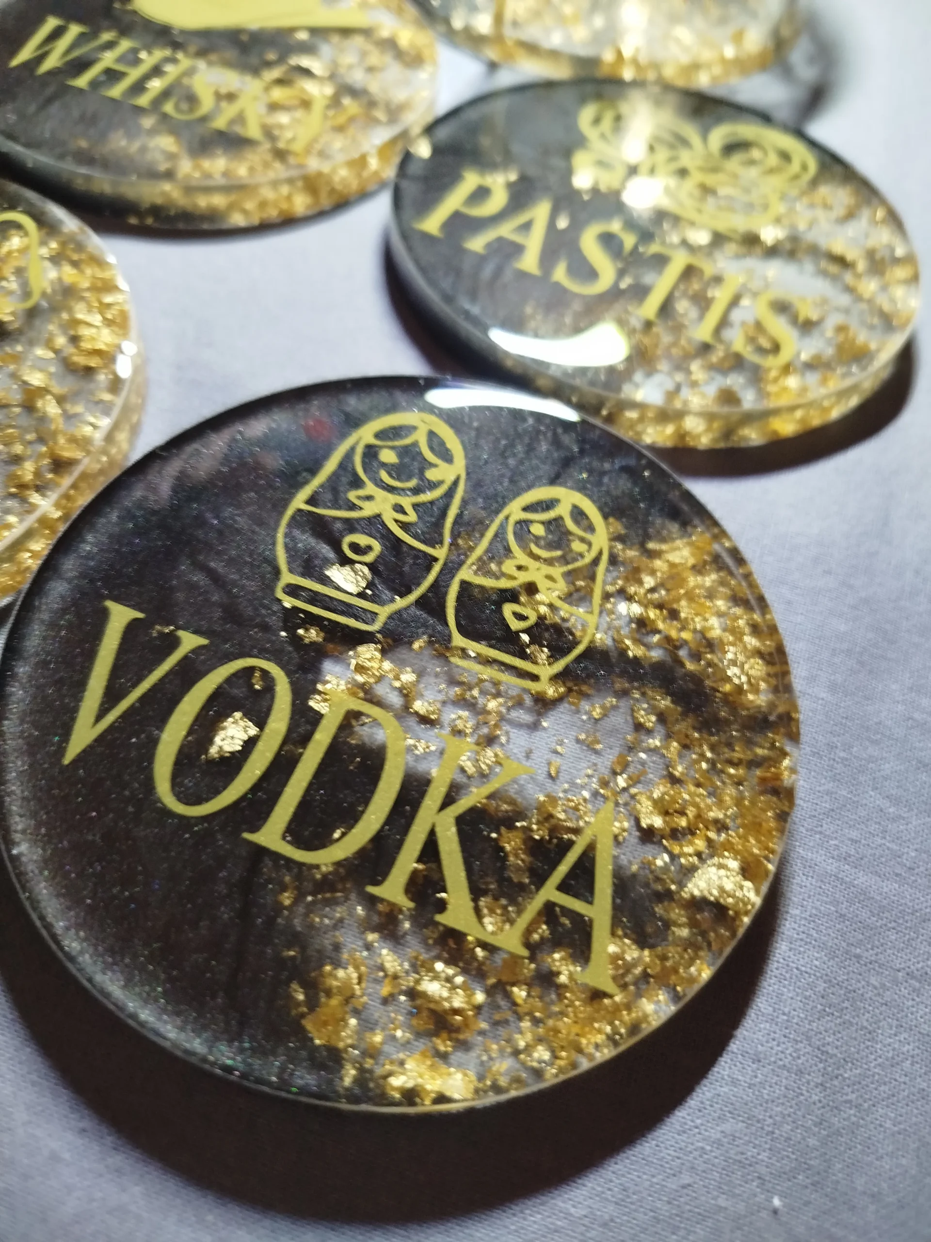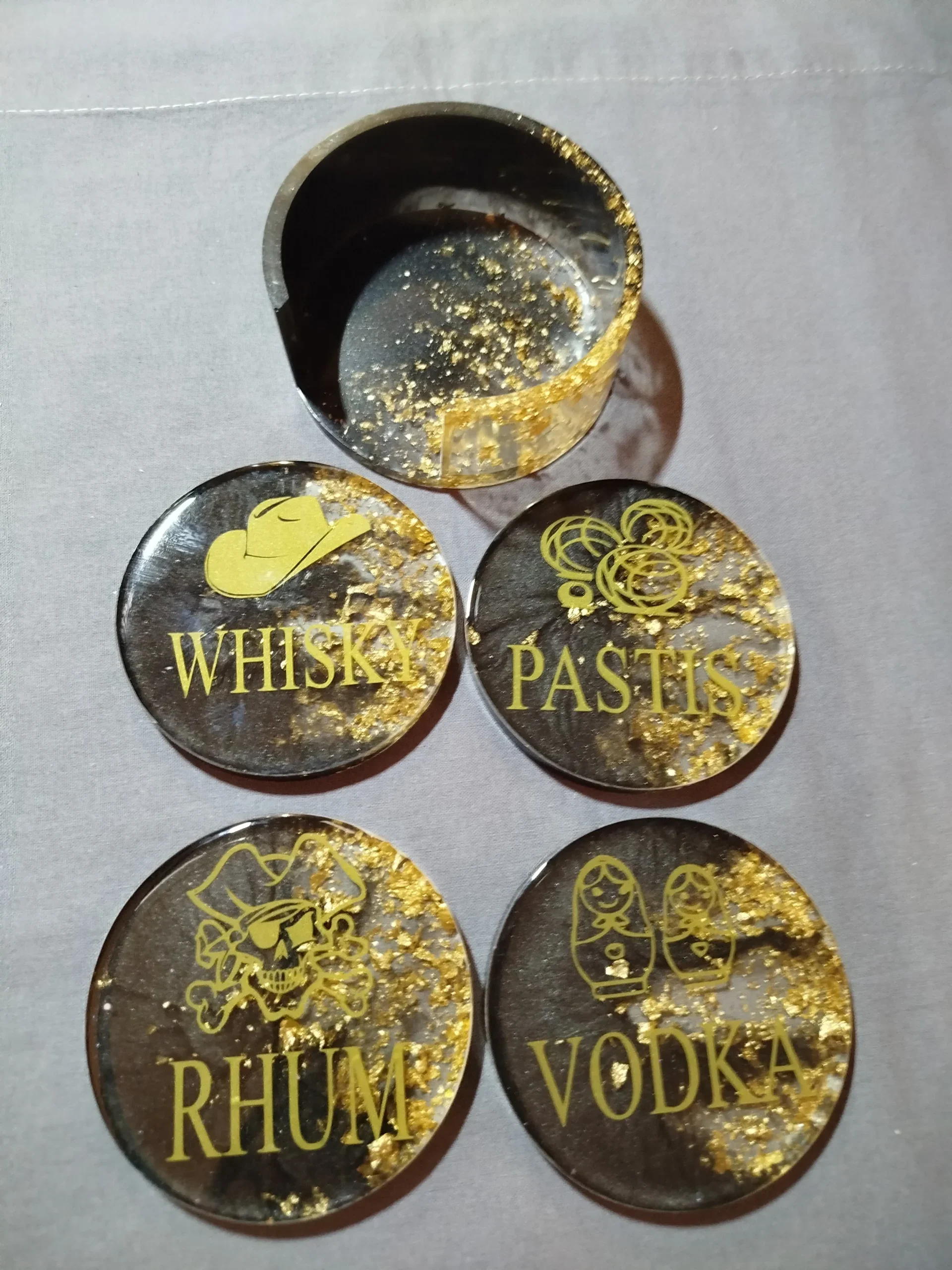 Parfait pour votre coin bar, vos soirées dégustation, ou comme cadeau pour un amateur de cocktails, cet ensemble de sous-verres fait main en résine époxy combine luxe et fonctionnalité avec une touche d’humour.