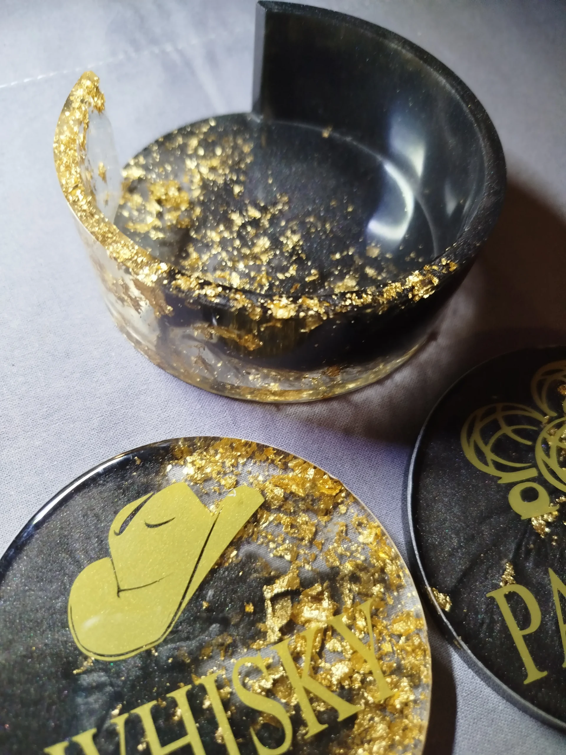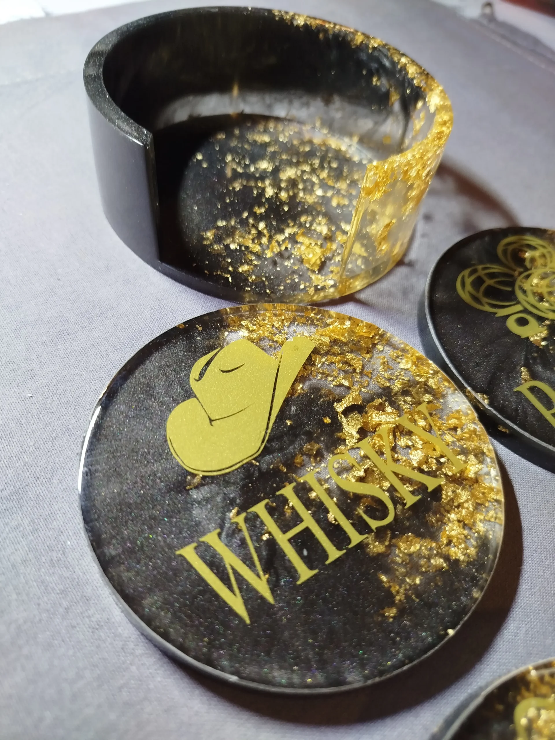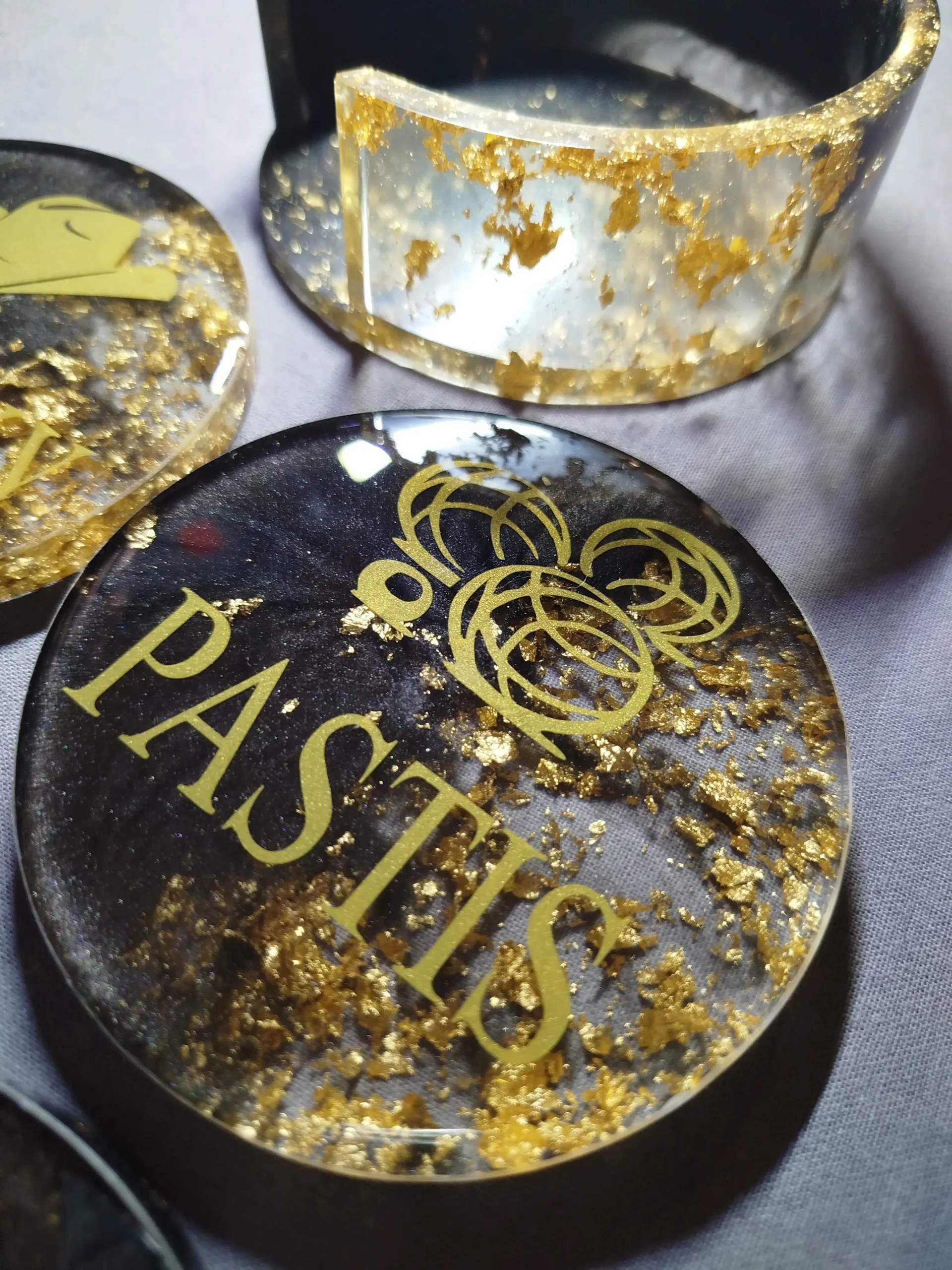 Parfait pour votre coin bar, vos soirées dégustation, ou comme cadeau pour un amateur de cocktails, cet ensemble de sous-verres fait main en résine époxy combine luxe et fonctionnalité avec une touche d’humour.