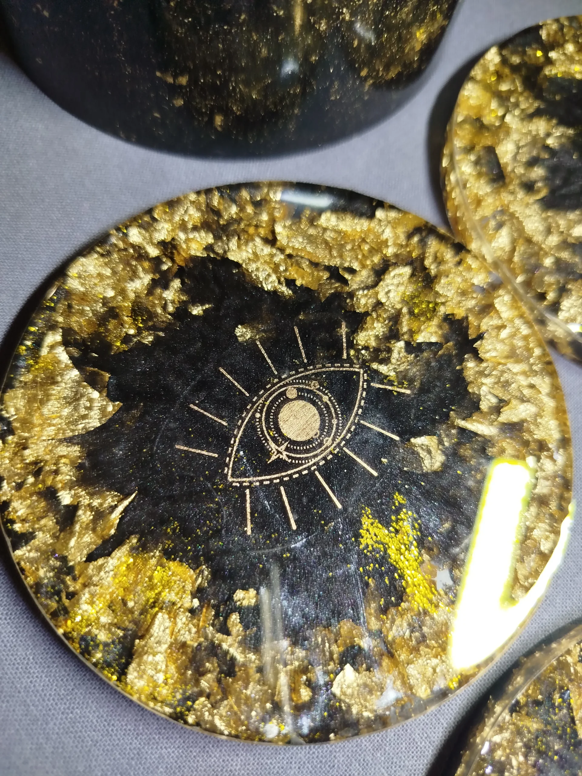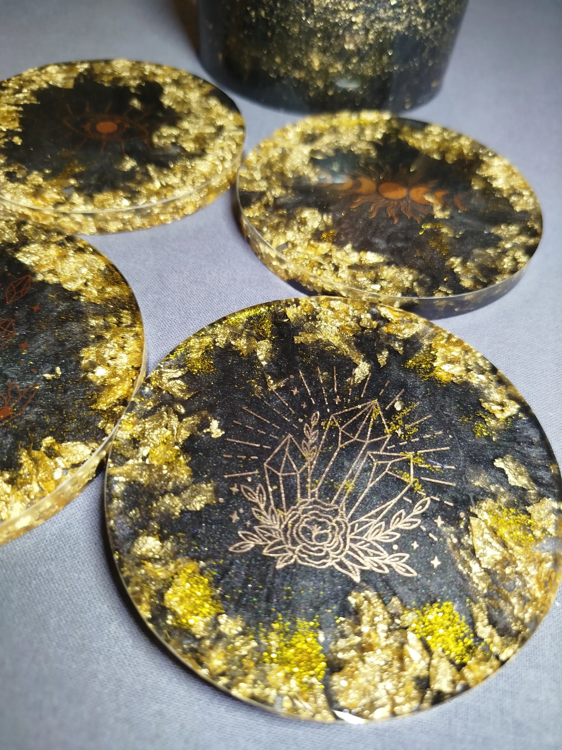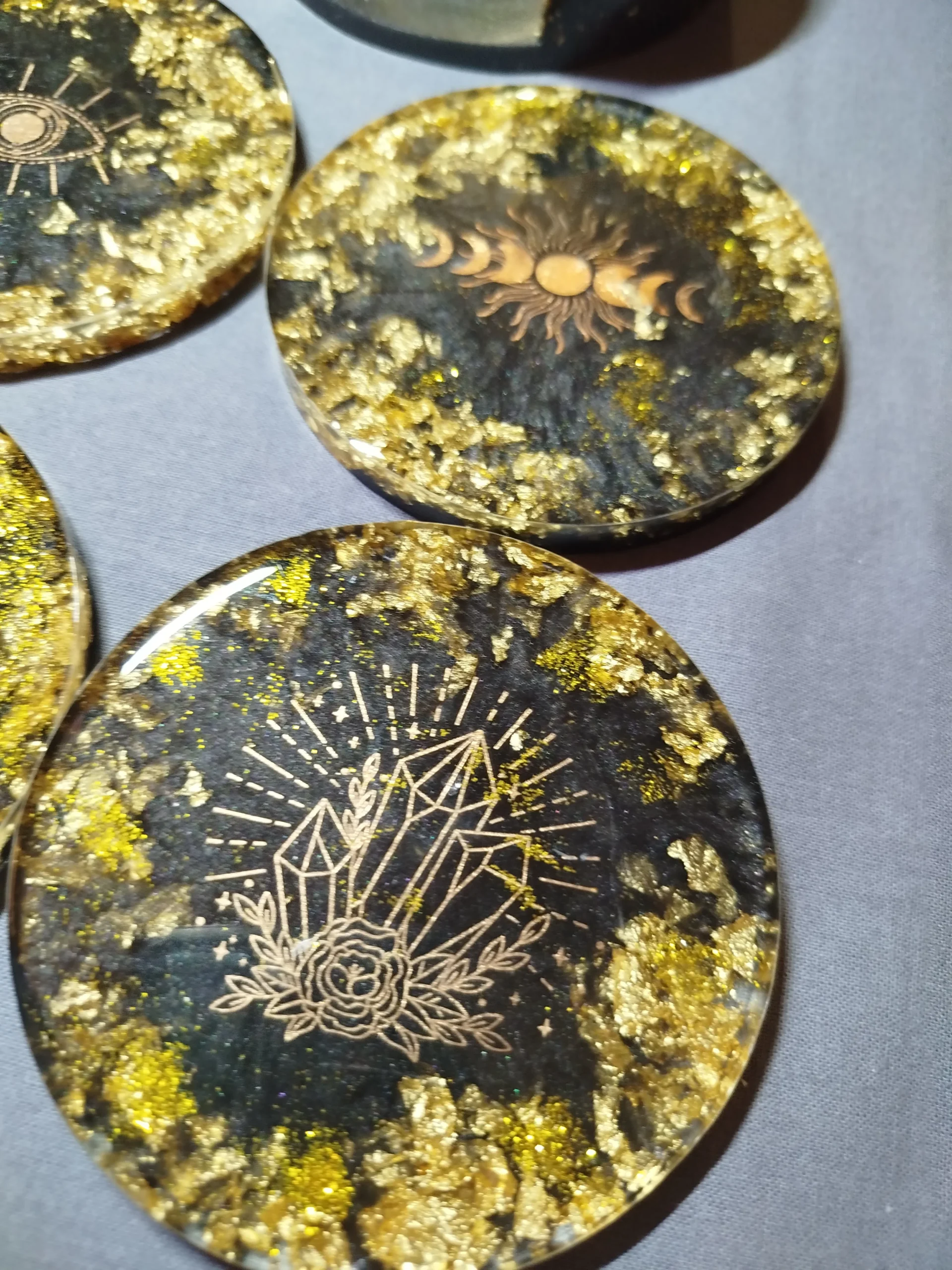 - Symbolisme Mystique : Chaque sous-verre est orné d'un motif délicat gravé (ou imprimé) dans une teinte dorée ou cuivrée, inspiré des thèmes ésotériques :