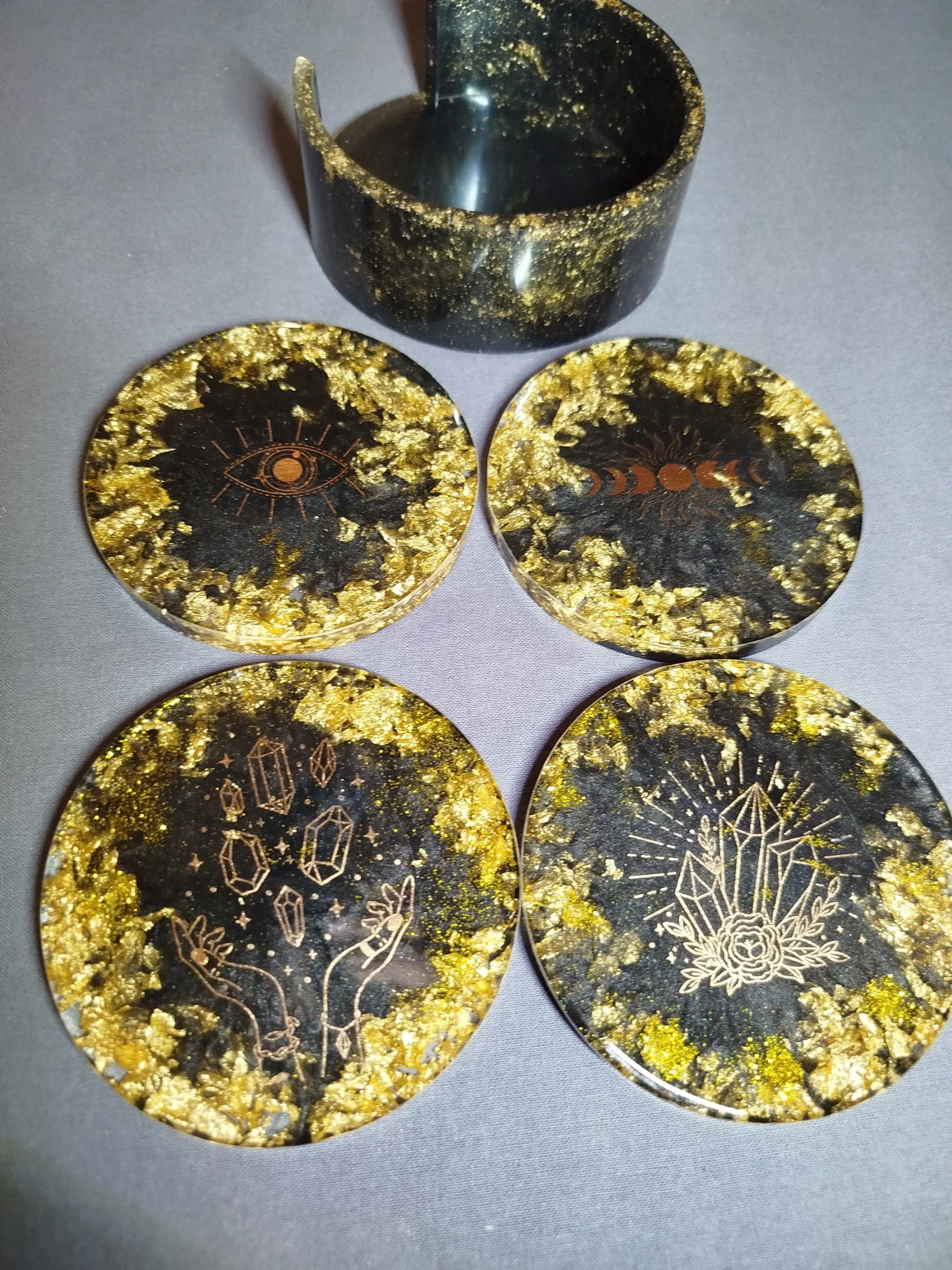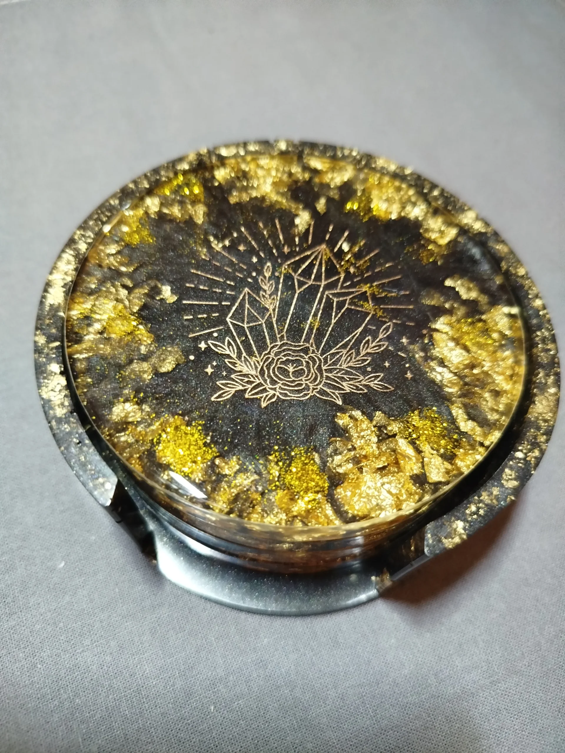 - Le Support : Le support, également en résine noire et or, permet de ranger les sous-verres de manière élégante et organisée lorsqu'ils ne sont pas utilisés.
