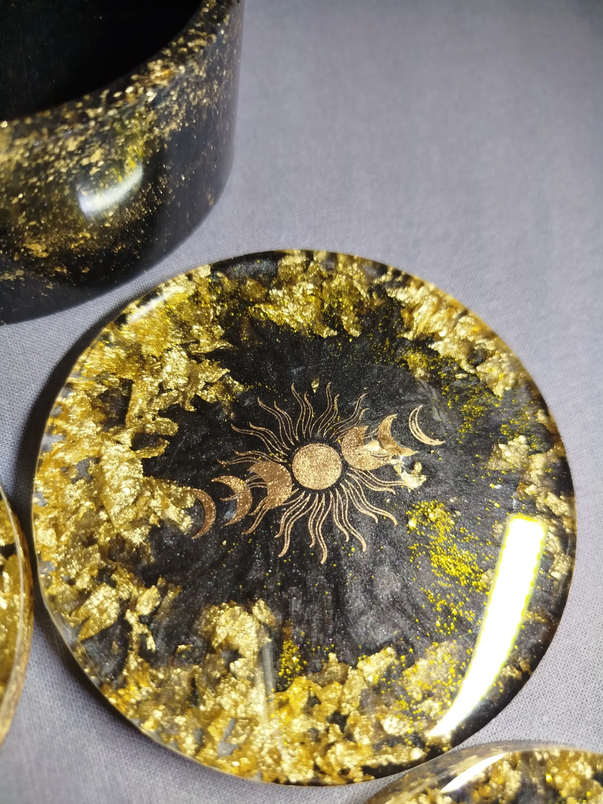Ce lot se compose de quatre sous-verres ronds et de leur support assorti, créés à partir d'une résine noire profonde, évoquant une nuit sombre et mystérieuse.