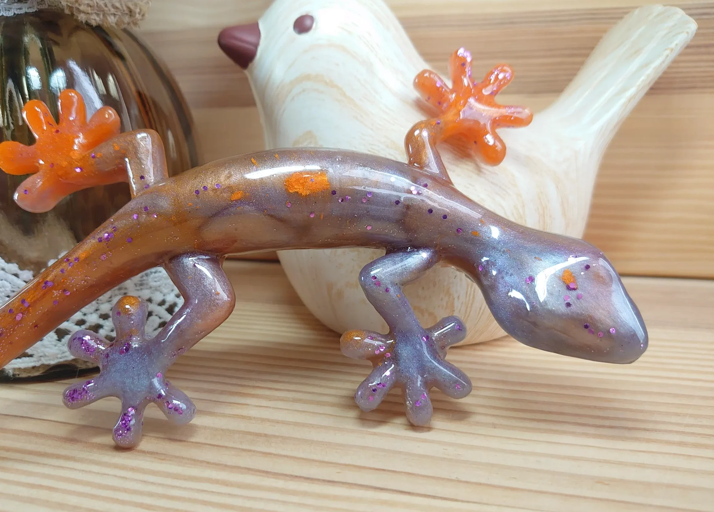 Salamandre décorative en résine – Orange & lilas – Fait main avec moule maison